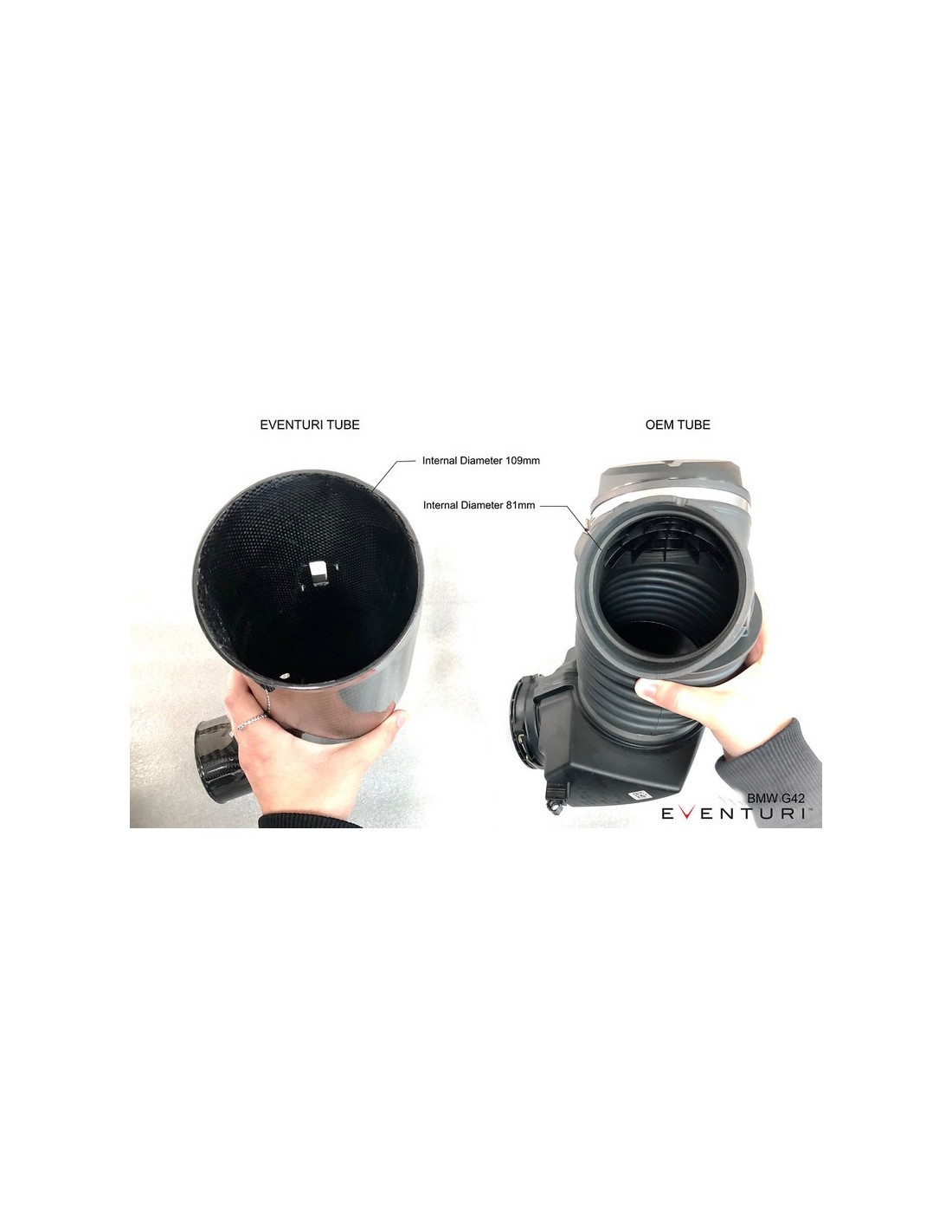 Il tubo di ingresso di serie ha una sezione flessibile e contorta per fornire movimento al motore. Ciò tuttavia aggiunge anche la possibilità di turbolenza nel percorso del flusso poiché vi sono più facce che possono causare vortici. Lo sostituiamo con il nostro tubo in carbonio che è liscio e ha anche un volume interno maggiore. A differenza della maggior parte delle prese aftermarket, abbiamo massimizzato le dimensioni del nostro tubo di aspirazione, il tubo di aspirazione OEM ha un diametro interno di 80,8 mm o 3,2 pollici all'estremità del filtro. Il nostro tubo ha un diametro interno di 109 mm o 4,3”. Ciò equivale a un massiccio aumento dell'82% dell'area della sezione trasversale rispetto allo stock. Il tubo si rastrema dolcemente verso l'ingresso del turbo di serie per garantire che il flusso d'aria rimanga il più laminare possibile. Il tubo è inoltre dotato di raccordo lavorato a CNC per il sensore di temperatura e l'adattatore di sfiato.