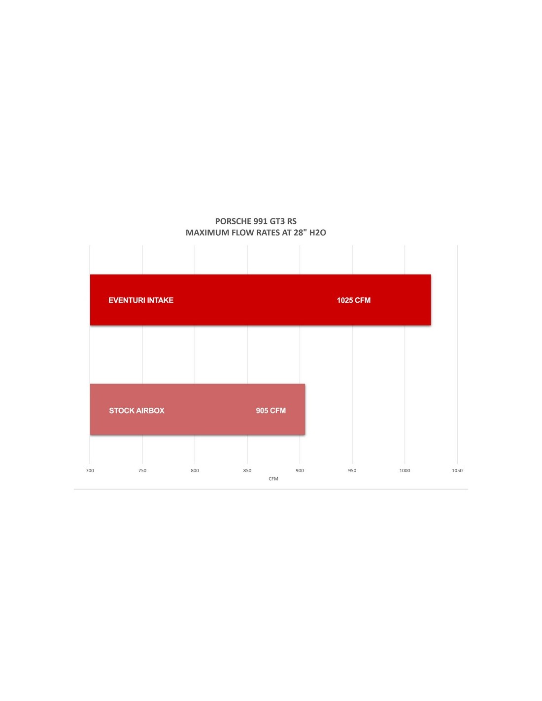 Abbiamo condotto test di portata utilizzando un Superflow SF-1020 per misurare la portata massima possibile con una caduta di pressione di 28” H2O. I test sono stati eseguiti lo stesso giorno in condizioni controllate utilizzando la stessa attrezzatura di prova per ciascun sistema. Abbiamo testato il nostro sistema di aspirazione completo rispetto al sistema airbox di serie. I risultati mostrano un aumento del flusso massimo di ulteriori 120 CFM rispetto all'airbox OEM. È importante sottolineare che ciò è stato ottenuto con un sistema di aspirazione sigillato in modo che anche le temperature di aspirazione siano mantenute al minimo.