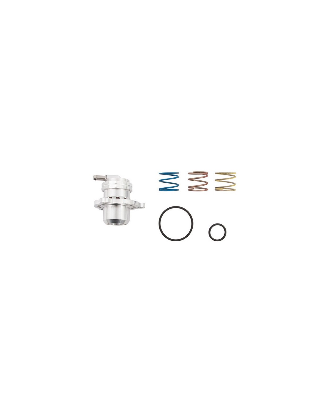 Si tratta di una valvola di bypass con design a pistone che sostituisce direttamente il dispositivo originale. Questa valvola offre una maggiore longevità rispetto alle valvole a membrana (OEM), ma beneficia anche della sua capacità di essere dotata di molle diverse quando la pressione di sovralimentazione è stata aumentata o il motore è stato modificato. Per facilitare l'installazione, la connessione superiore o del vuoto è angolata.