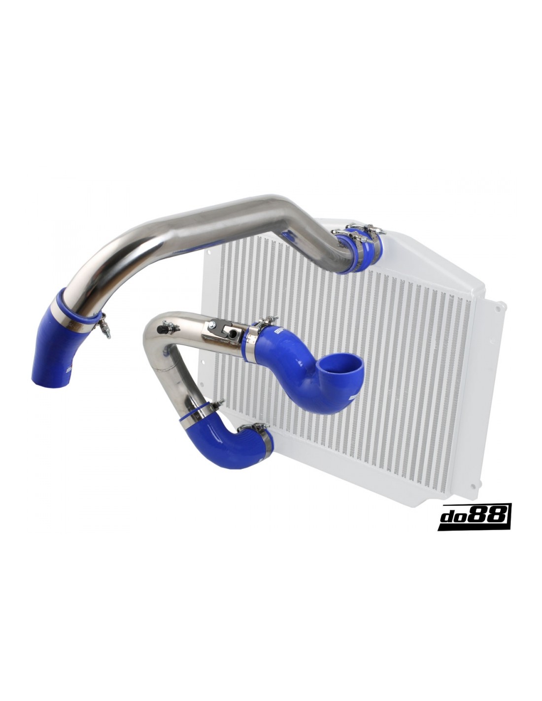 I tubi di pressione sono realizzati in tubi in acciaio inossidabile piegati a mandrino da 2,5". Questi tubi invertono il flusso attraverso l'intercooler: l'aria che va al corpo farfallato viene prelevata dalla parte inferiore dell'intercooler. Questo riduce la lunghezza totale del DO88 Tubi 600 mm più corti dei tubi OEM.