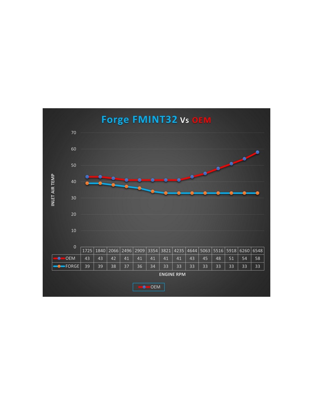 Durante i nostri test approfonditi, abbiamo lasciato che il calore dell'auto si assorbisse al banco fino a quando le ventole del radiatore non si accendevano e si spegnevano (il che dà una temperatura di ingresso di circa 40°C), quindi abbiamo eseguito un tiro al banco da questo punto, in questo modo si ottiene un risultato più coerente e riflette le condizioni di guida del mondo reale in modo più accurato. Puoi facilmente vedere che l'intercooler Forge si raffredda molto più rapidamente e offre un calo di temperatura molto maggiore rispetto all'OEM.